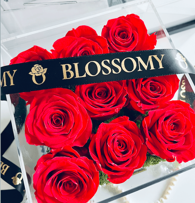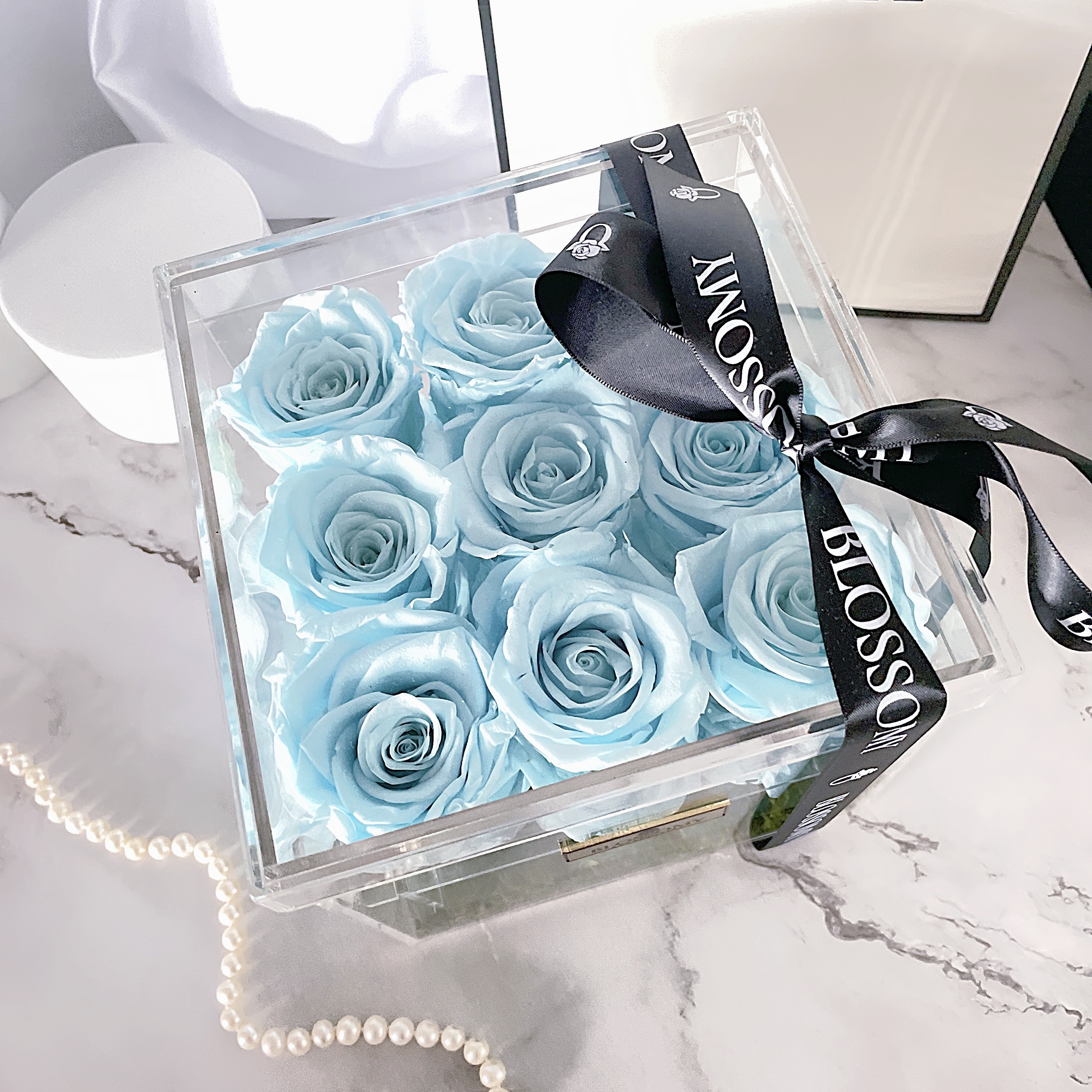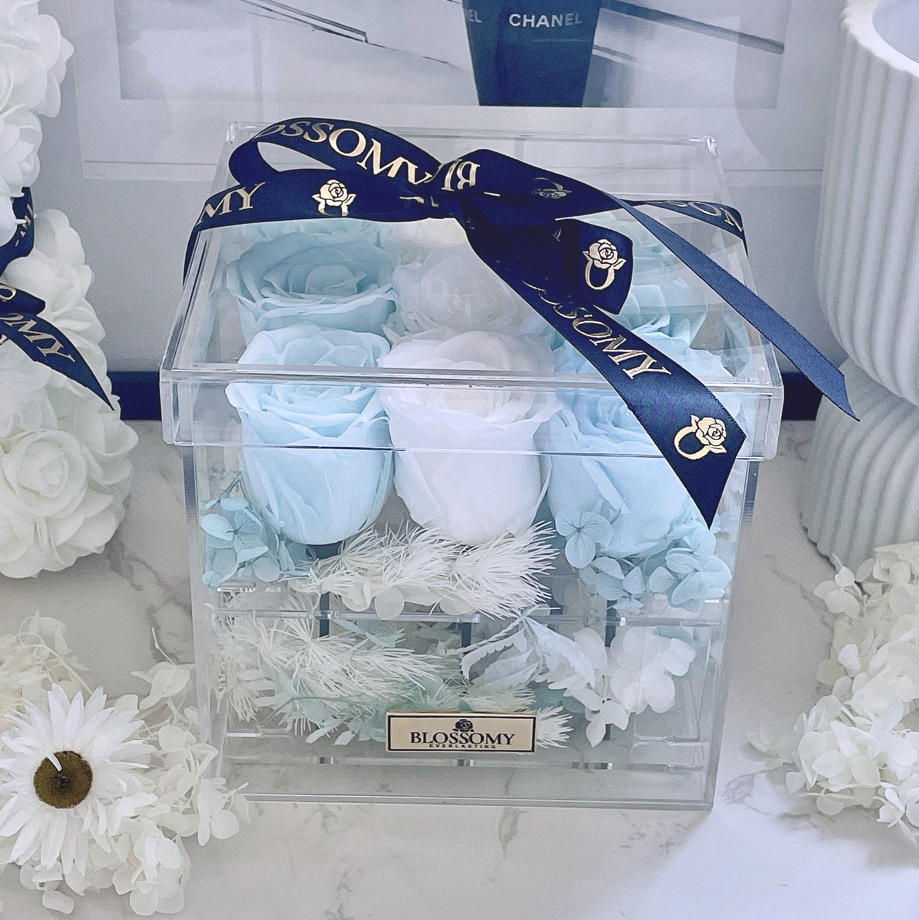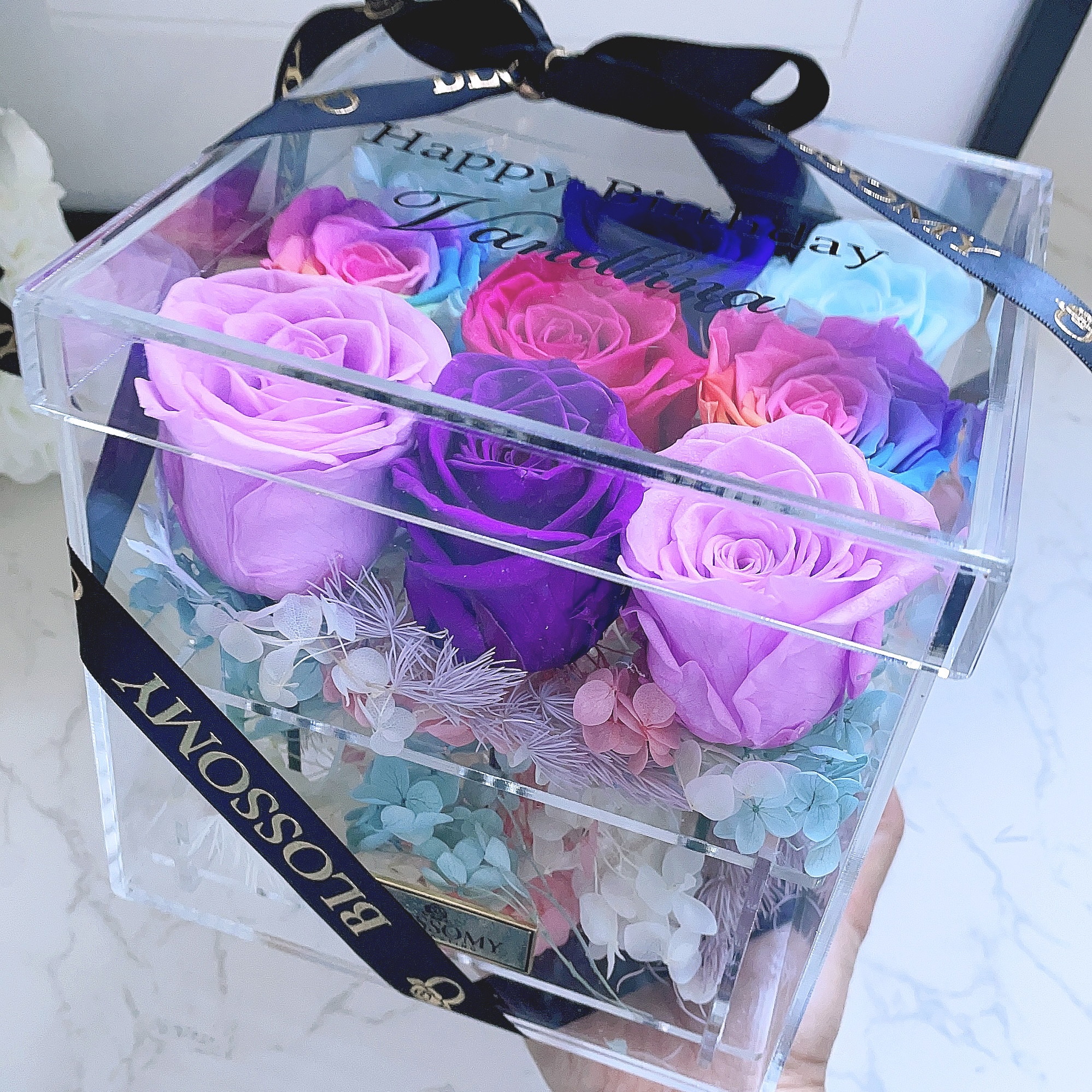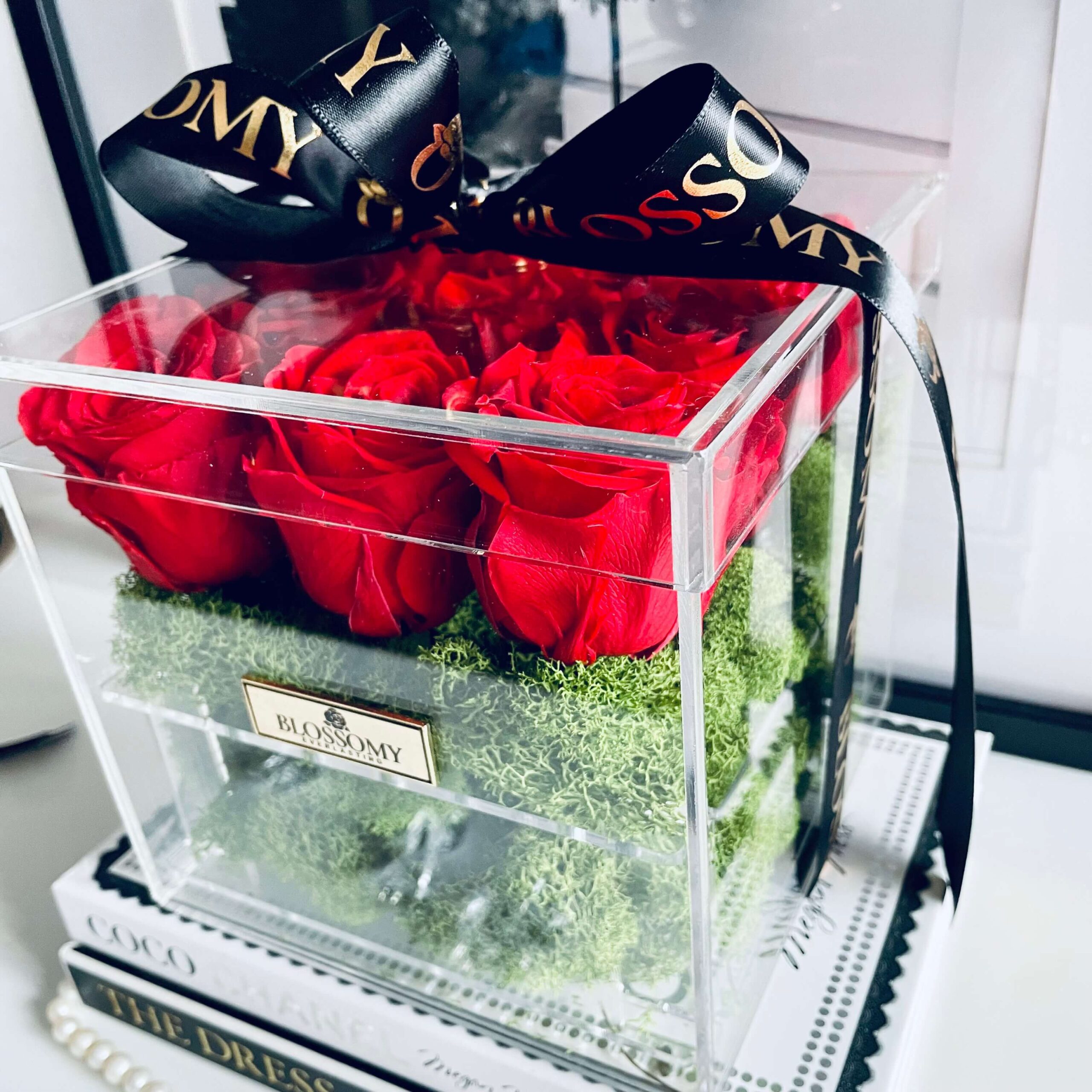 Introducing our stunning acrylic box filled with preserved roses that last up to three years. Our uniquely designed roses colour of your choice rest on top of everlasting preserved green moss, given the most beautiful statement blooms by nature.